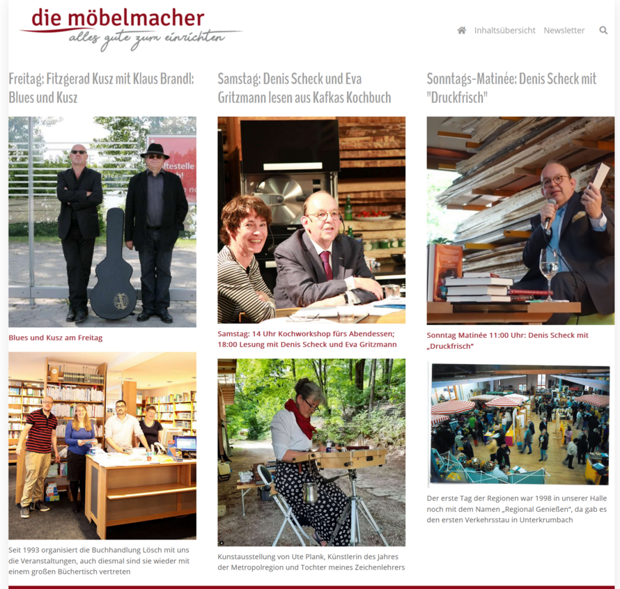 Hochaktuell sind unsere Infos, Nachrichten, Ankündigungen, Einladungen und Meldungen. Nicht nur über die Möbelmacher, sondern auch über andere wichtige Dinge in unserer Region. Noch aktueller sind nur unser Nachhaltigkeitsblog oder unsere NachrichtenOpens external link in new window auf Facebook.