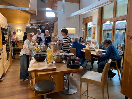 Schauen Sie am Samstag einfach rein (10 bis 16 Uhr), für ein Gläschen Schaumwein, ein paniertes Sellerie-, Weideschwein oder Saiblingschnitzel ist fast immer Zeit. Genießen und/oder kochen Sie mit uns in der höhenverstellbaren Küche. Gerne bieten wir auch Führungen in der schönsten Werkstatt Deutschlands (dds-Preis 2024) an.