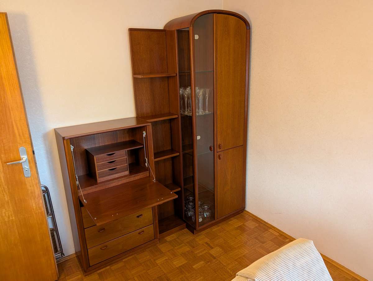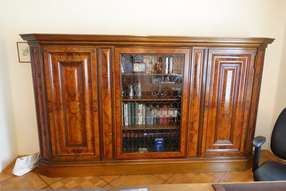 8. Link „ÜBRIGES“ mit klassischem Schreibtisch und Schrankwand in Wurzelmaser, Bett, Leuchte, Türfräsmaschine