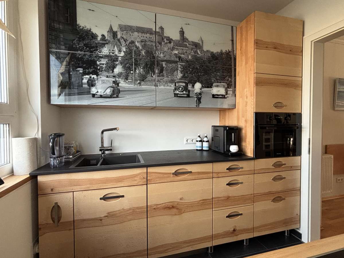 Zugegeben, die Insel ist nicht riesig, aber man kann in dieser Küche angenehm zu zweit kochen und sitzen. Und das ist für uns ein Symbol der Lebensqualität im Gegensatz zu den Küchen, in denen man nur an der Wand lang kochen kann. Für das Foto in den Oberschränken hat sich Michael im Archiv der Stadt Nürnberg ein Foto gekauft, das wir hinter die Glastüren drucken ließen. Um den Preis für diese minimalistische Variante im Rahmen zu halten, haben wir wieder lamellierte Buche aus industrieller Fertigung für die Korpusse verwendet, die Fronten sind aus dem Holz der Hersbrucker Alb von Moritz liebevoll mit rotkerniger Buche komponiert.
