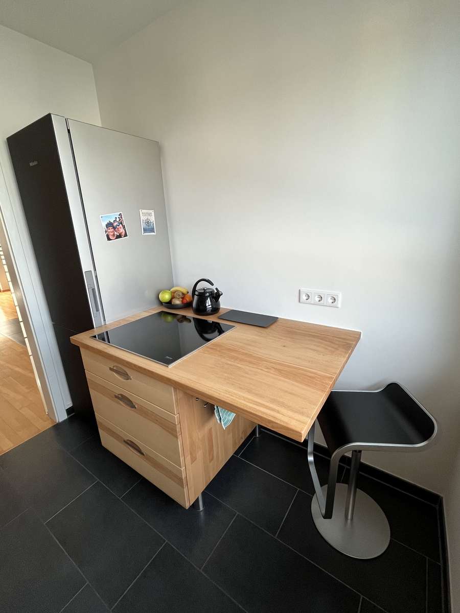 Übrigens hat die Kochinsel, die Platz zum Sitzen macht, dank der großen Tiefe genau 1,1 Quadratmeter Fläche, würde man die normale Arbeitsplatte bis an die Wand durchziehen, kämen auch 1,1 Quadratmeter raus. Also haben dank Koch-Inselbegabung keinen Platz hergeschenkt und trotzdem zwei Sitzmöglichkeiten geschaffen.