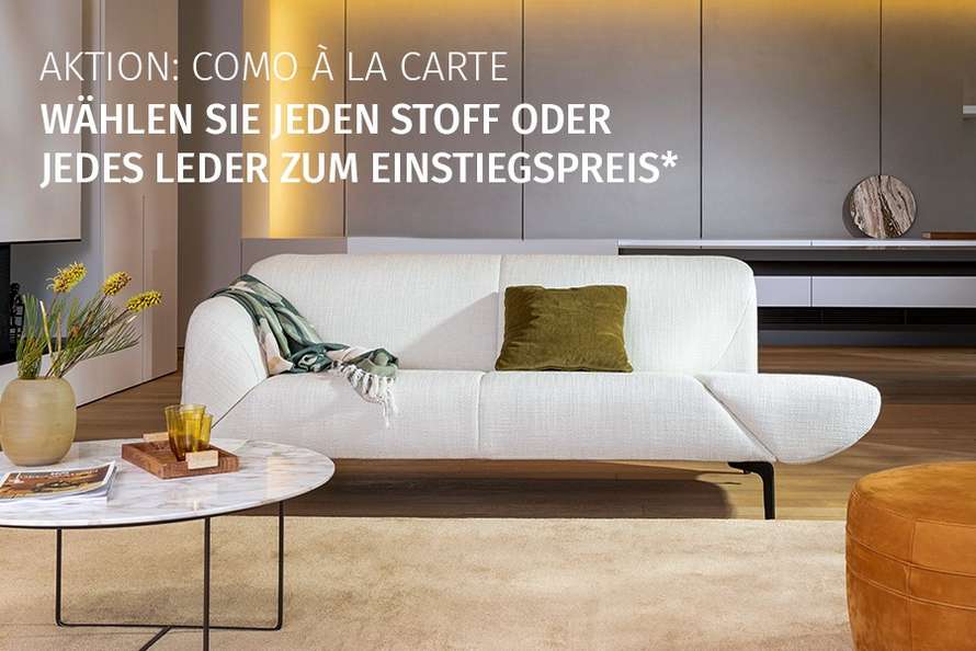 Bis zum 31.01.2026 erhalten Sie beim Kauf eines Como- oder Pacific Pure-Sofa den günstigsten Bezugspreis, unabhängig von der tatsächlich gewählten Stoff- oder Lederqualität. Das heißt, jeden Stoff zum Preis der Stoffqualität F1, alle Lederqualitäten zum Preis des Einstiegsleders Celia.